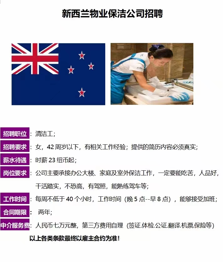 新西兰物业公司清洁工招工简章