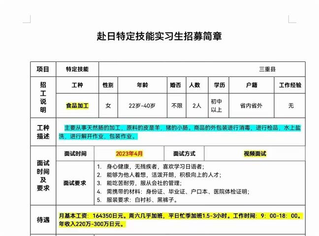 赴日本特定技能食品加工招工简章