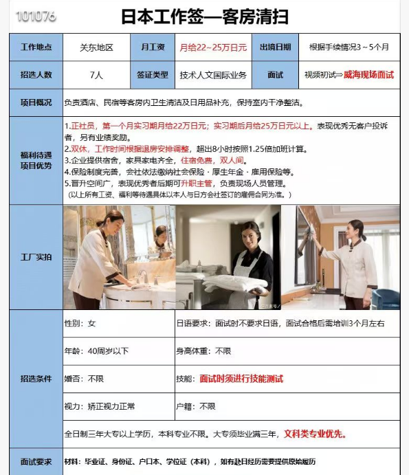 赴日工签客房清扫招工简章