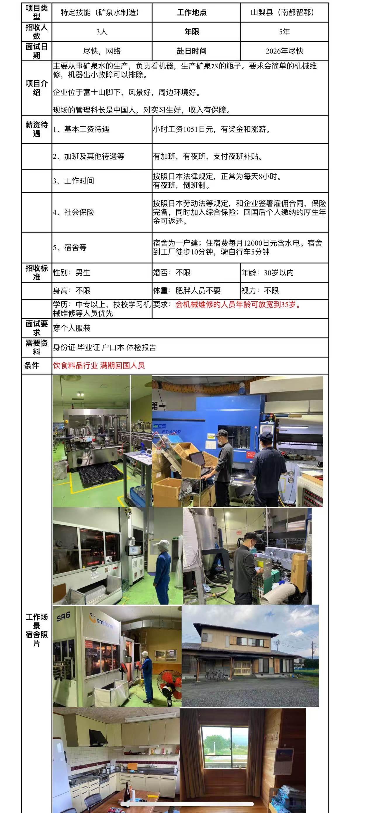 赴日山梨特定矿泉水制作招工简章
