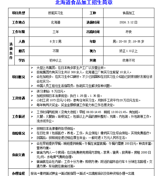 赴日本北海道食品加工招工简章