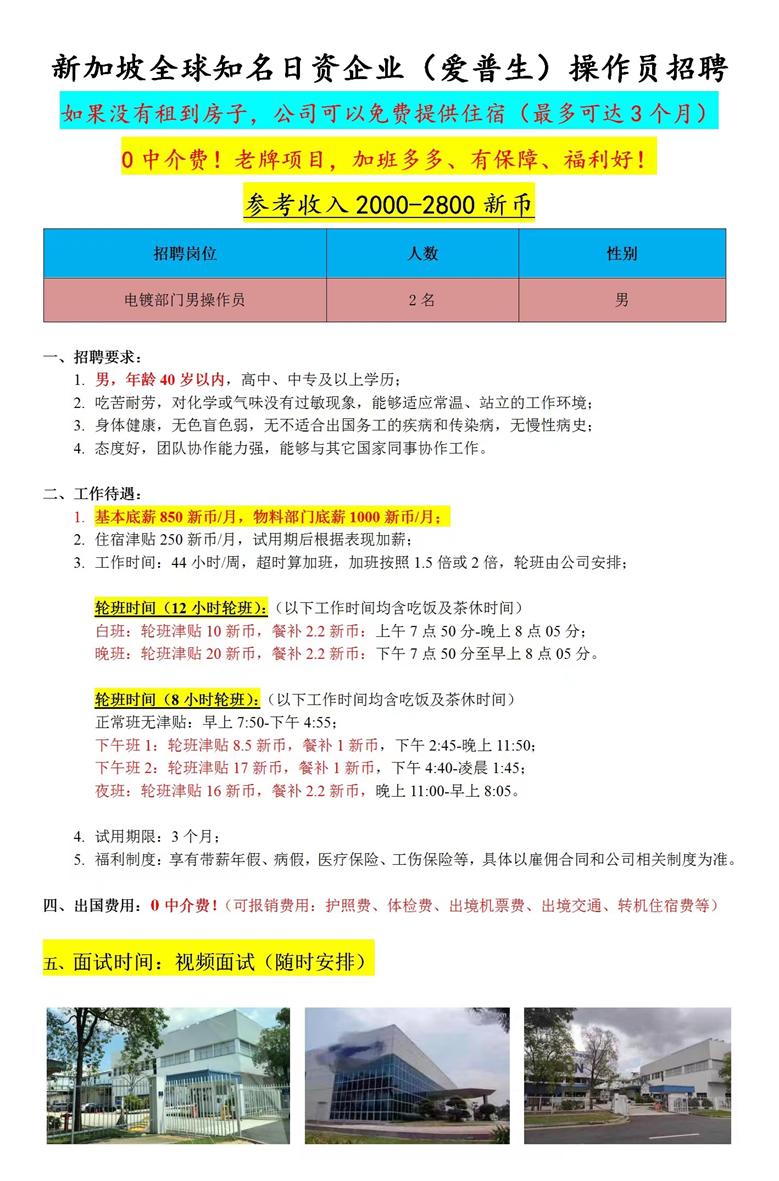 0收费+报销多样费用+多项福利。每年7月份加薪、花红,年底十三薪…免费班车,实惠员工食堂…参考收入2000-2800新币!