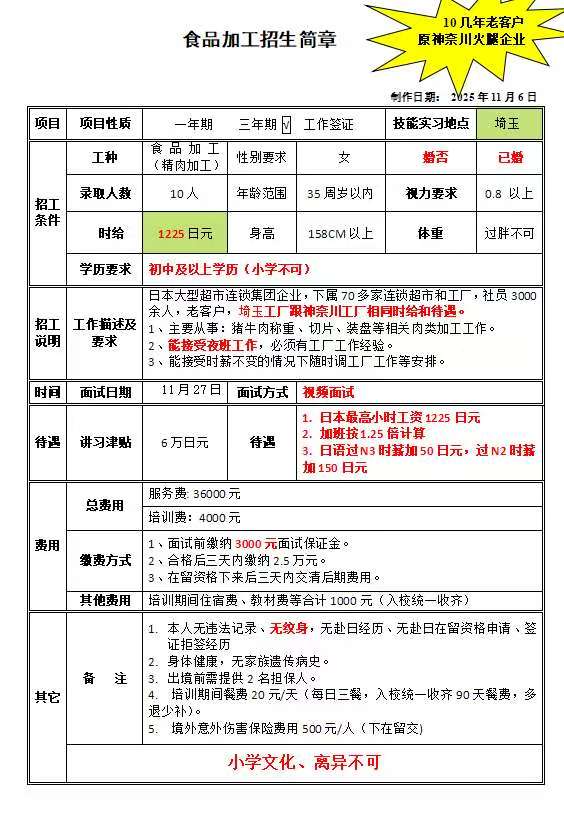 赴日精肉加工招工简章