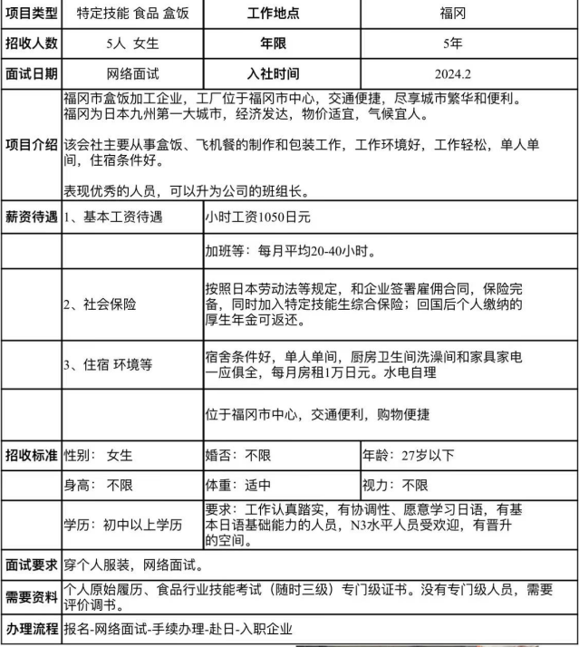 日本特定技能盒饭加工招聘简章