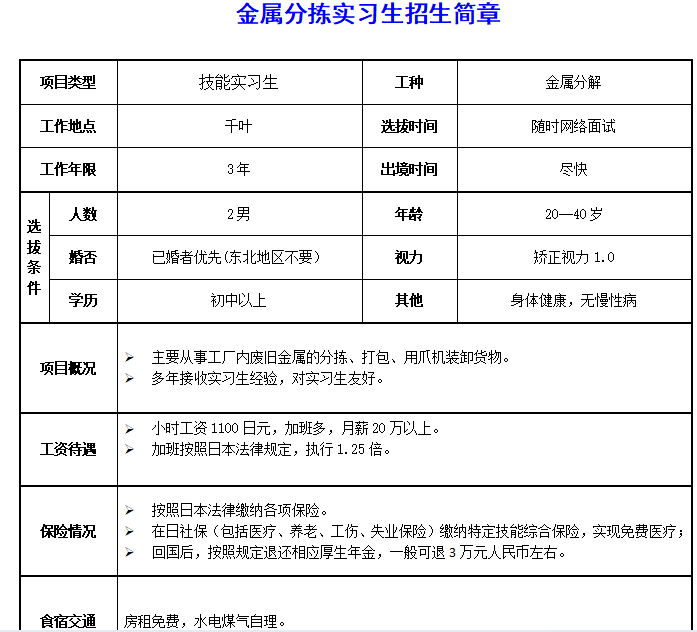 赴日千叶县金属分解招工简章