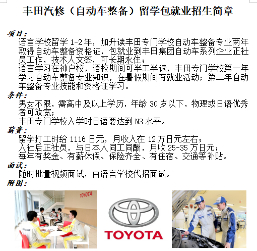 赴日本丰田汽修留学包就业招生简章