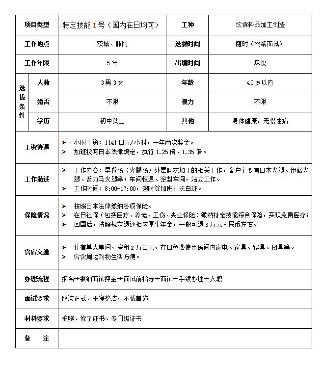 赴日本茨城,静冈县饮食料品加工招工简章